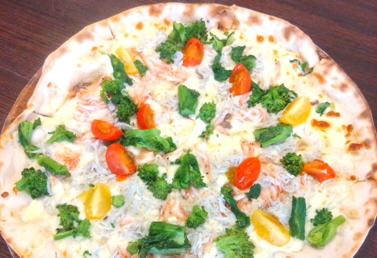 ②シラスと桜海老、菜花、チェリートマトのアンチョビガーリック