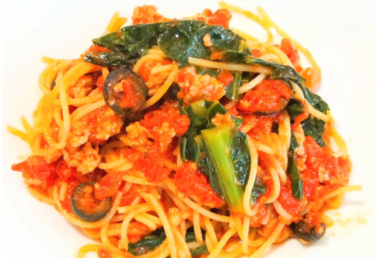 ①自家製サルシッチャと小松菜、オリーブのトマトソース