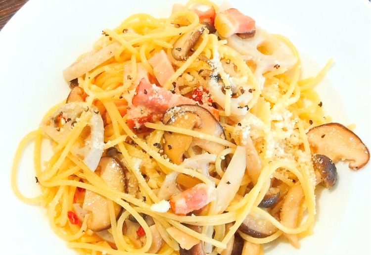 ②旨みベーコンとレンコン、きのこのペペロンチーノ