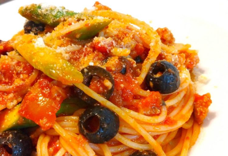 ①自家製サルシッチャとアスパラ、オリーブのトマトソース